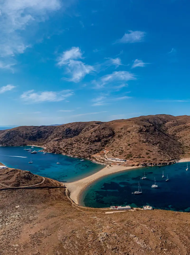 Set sail to Kolona Beach, one of the most breathtaking spots in the Aegean. This stunning double-sided beach, where golden sand divides two shimmering turquoise bays, is the perfect island escape. Swim, sunbathe, and experience the raw beauty of the Cyclades.